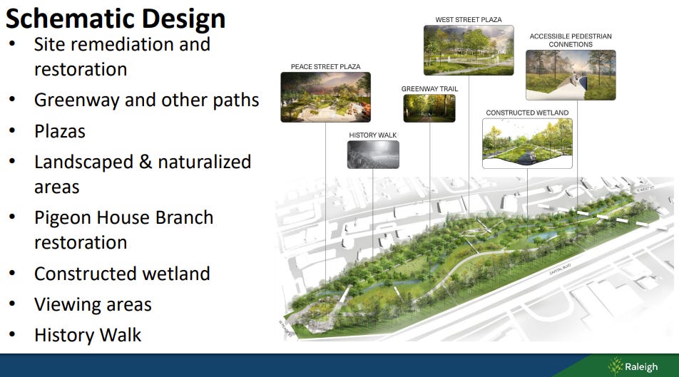 This site, between West Street and the planned Smokey Hollow Park, is exactly where apartments belong: in downtown Raleigh, beside a new park, across the street from a grocery store and along the planned Northern BRT route. The proposal would add over 900 apartments, new retail, and new office space in a walkable district that already includes apartments and daily services. This is exactly the type of increased density Raleigh needs to support its housing, climate, and transit goals. The park itself is under design to become a central green space for downtown and environmental restoration project for Pigeon House Branch.