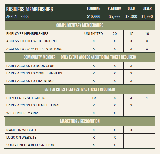 CITYBUILDER is powered by community leaders. By becoming a Business Member, your organization joins a coalition of changemakers driving positive housing policy and urban growth. Explore the membership levels below and select the one that best fits your commitment to our shared mission