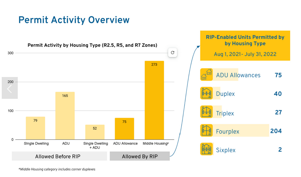 Portland is different: Portland, Oregon seems to have cracked the code, experiencing a major uptick in middle housing construction after it legalized up to four homes per lot citywide in 2020. From 2021-2022, more quadplexes were built than single-family homes.