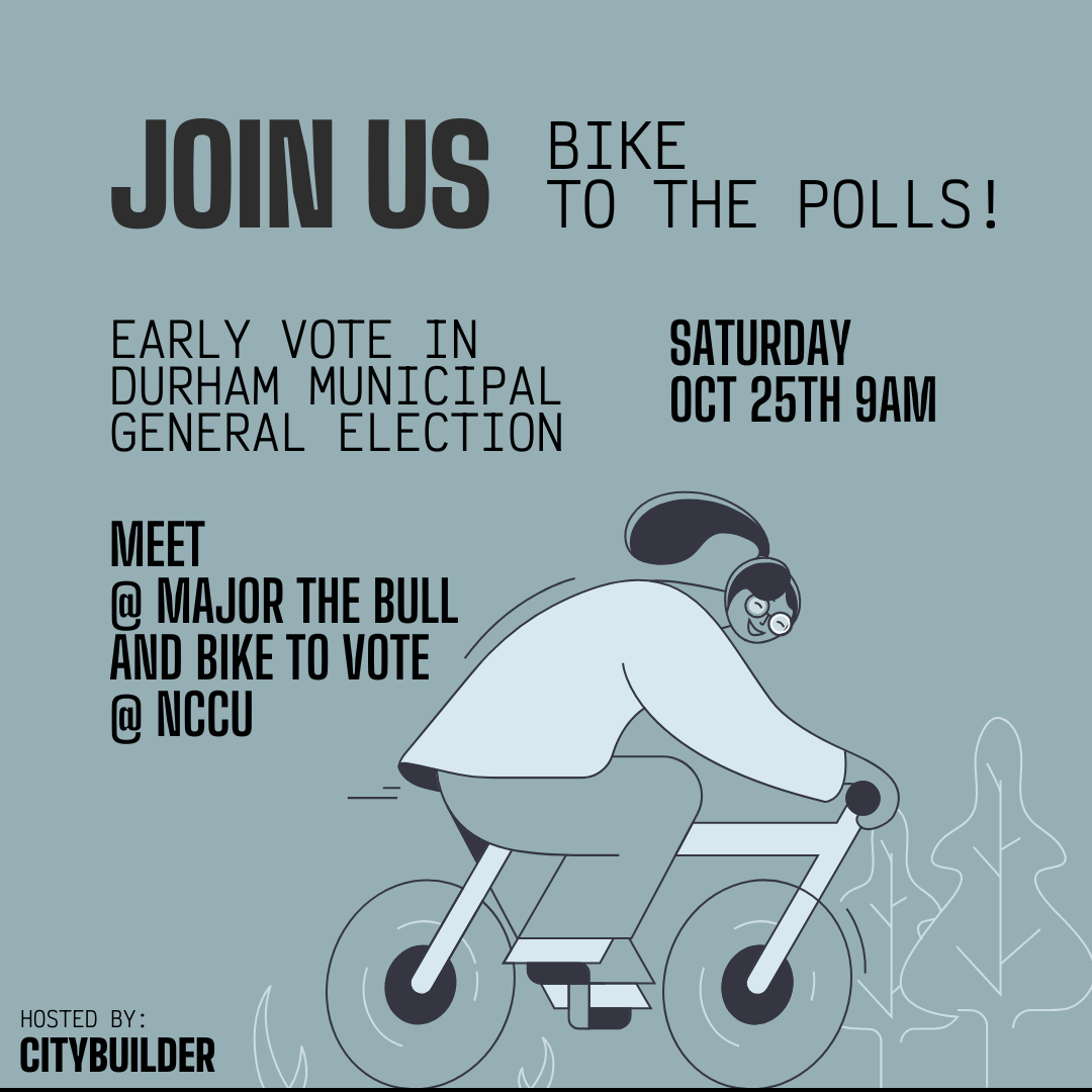 Join fellow CITYBUILDERS to bike to the polls! We’ll be taking the 2.5 mile-ish (5 total there and back) ride from Major the Bull over to Early Vote at the NCCU Turner Law Building (640 Nelson Street, Durham).