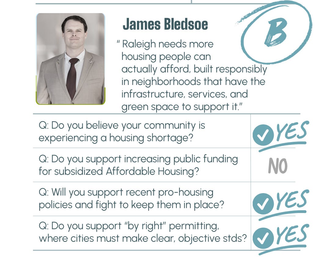 James Bledsoe earns a B for his clear understanding that increasing supply, reducing regulatory barriers, and reforming zoning are central to long term affordability. He supports expanding missing middle housing, reducing outdated height limits, and improving permitting predictability, which are all meaningful pro housing positions. However, his approach to housing stability and public subsidy is more limited and cautious, and we believe stronger commitments in those areas are necessary to fully address displacement and short term affordability pressures.