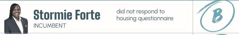 Stormie Forte earns a B based on her voting record and tenure on City Council since 2021. While she did not submit responses to our questionnaire, her record shows consistent support for missing middle housing and necessary zoning reforms to enable attainable housing. Recently, she voted yes on major rezonings such as Peace and West and North Hills, signaling a willingness to allow more housing in Raleigh’s denser urban areas. At times though, she has expressed more hesitation around apartment development, even in transit rich areas, but her overall record demonstrates meaningful support for housing growth when it matters most.