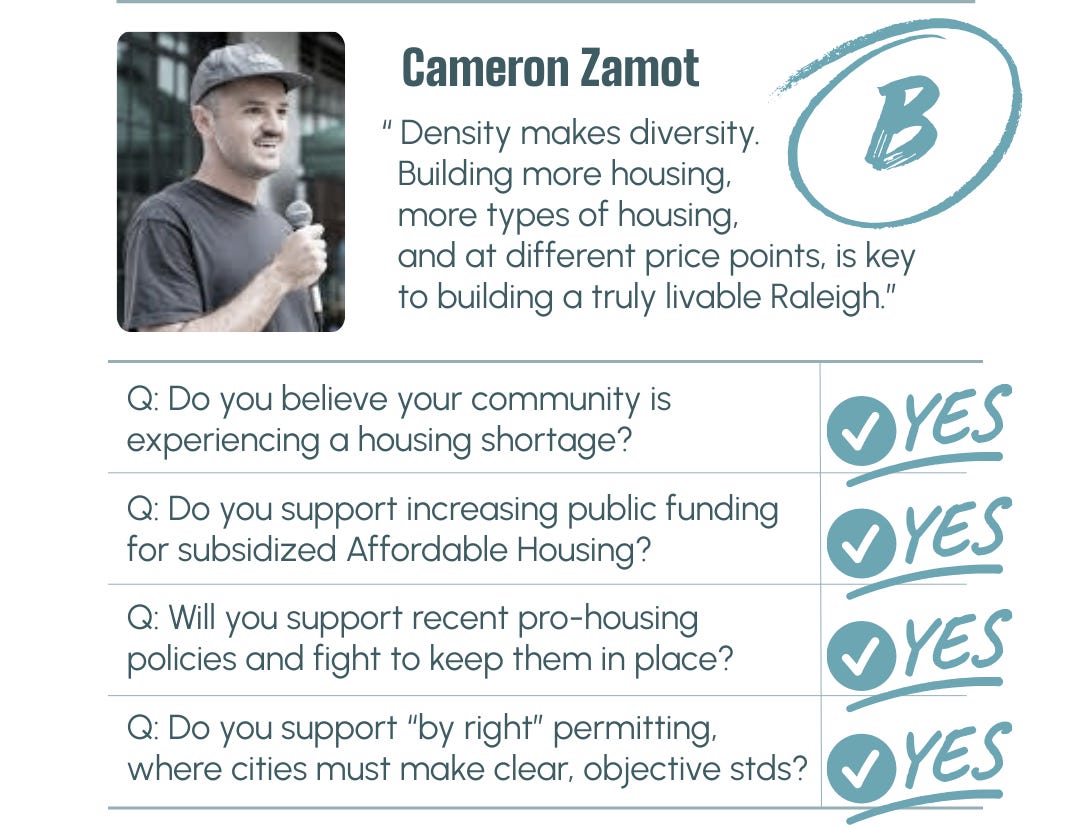 Cameron Zamot is one of the stronger housing candidates in this field, earning a B for his clear support of missing middle housing and meaningful permitting reform. He understands how zoning classifications, lot size rules, and building code barriers affect the feasibility of fourplexes and other small scale housing, and he connects density directly to walkability and bike friendly neighborhoods. We have concerns about attaching inclusionary zoning requirements to small scale projects, which could limit production, but we respect his seriousness and engagement on the core supply issues facing Raleigh.