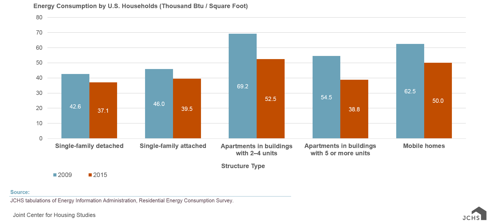 The chart above seems to show that single-family homes actually use less energy than multifamily units, but that’s only true on a “per square foot” basis. Single-family homes in the US are on average 2.5 times bigger than multifamily residences, so in the context of energy per square foot, single-family homes have a deceptive advantage. If we account for the vast size difference between single-family and multifamily homes, we find that multifamily homes having a lower rate of energy consumption overall.