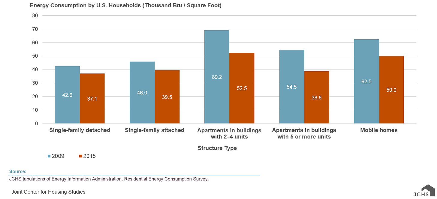 It’s been that way for a while: between 2009 and 2015, energy usage per square foot dropped by 29% in multifamily residences, while single-family homes saw a reduction of only 13%. While residential energy consumption has become more efficient overall, single-family homes are lagging behind denser housing options on all fronts.