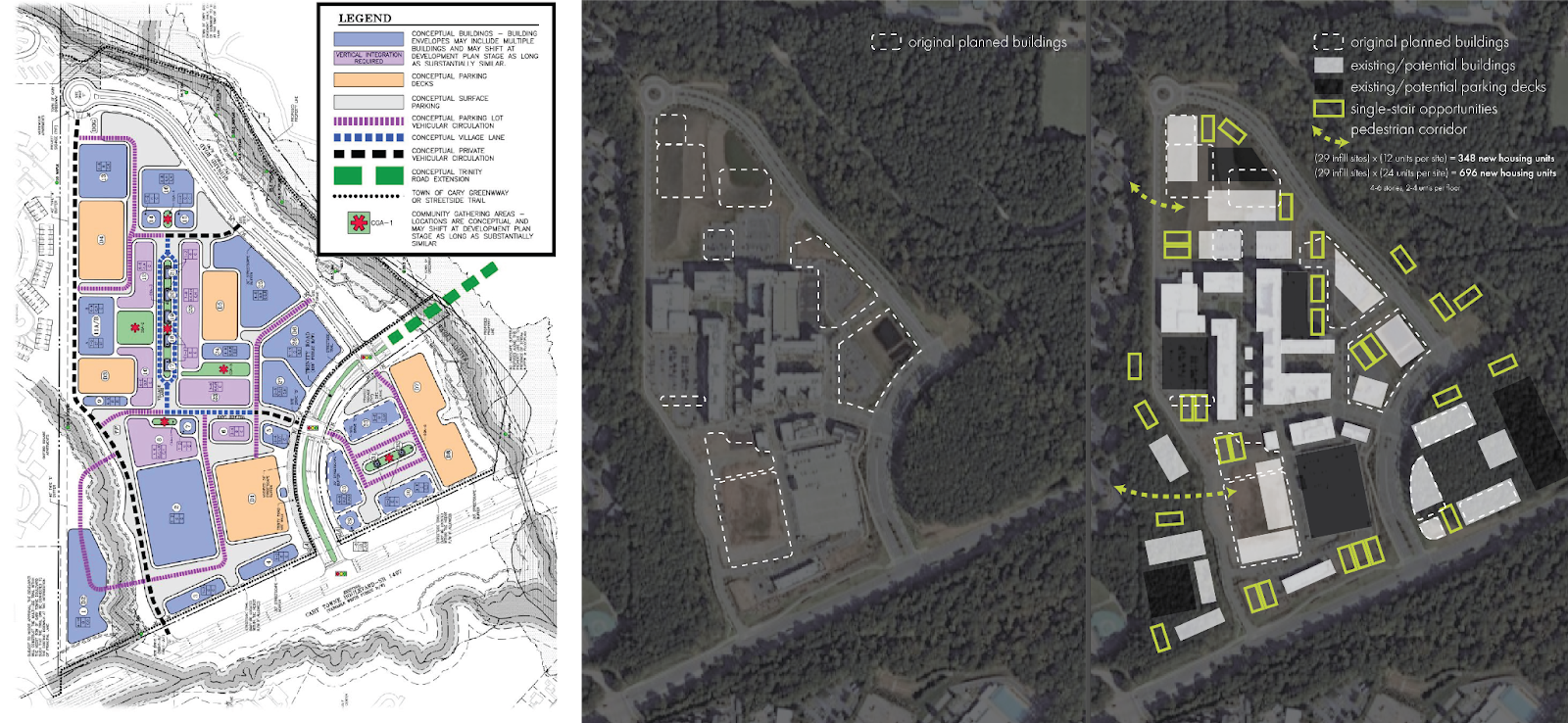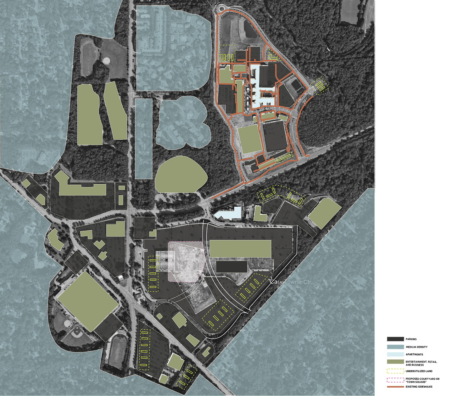 The former Cary Towne Center site embodied the same pattern prior to redevelopment: a mall ringed by parking, accessible primarily by car, designed for peak occupancy rather than everyday integration.