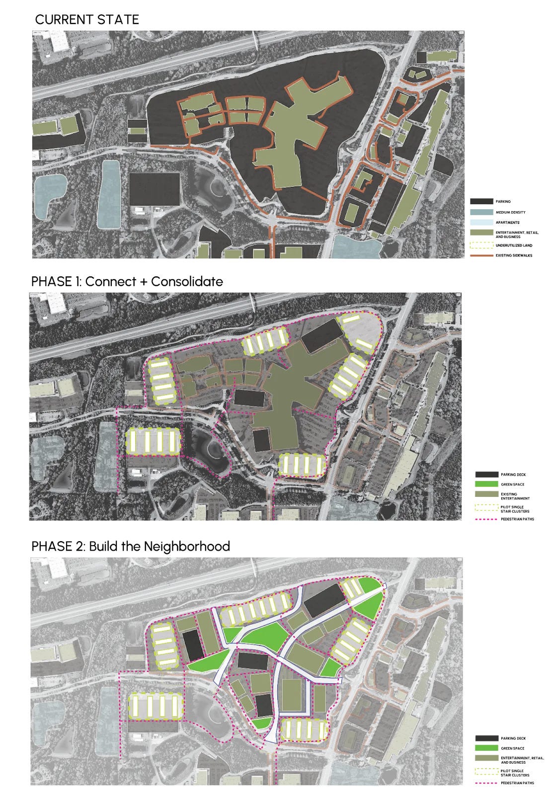 It’s no secret that shopping in America requires a significant amount of parking spaces. In the development of single-stair buildings on small infill lots, parking poses a significant challenge. The lack of space for a large-scale apartment means that there is also very limited onsite space for parking to exist. Commercial shopping malls offer a unique chance to solve this problem by creating a dynamic in which parking that goes underutilized in off-peak hours could serve as parking for single-stair residences.