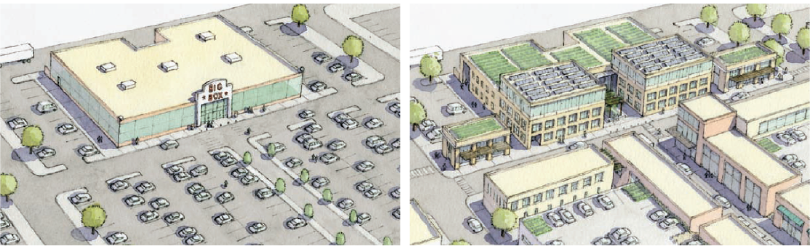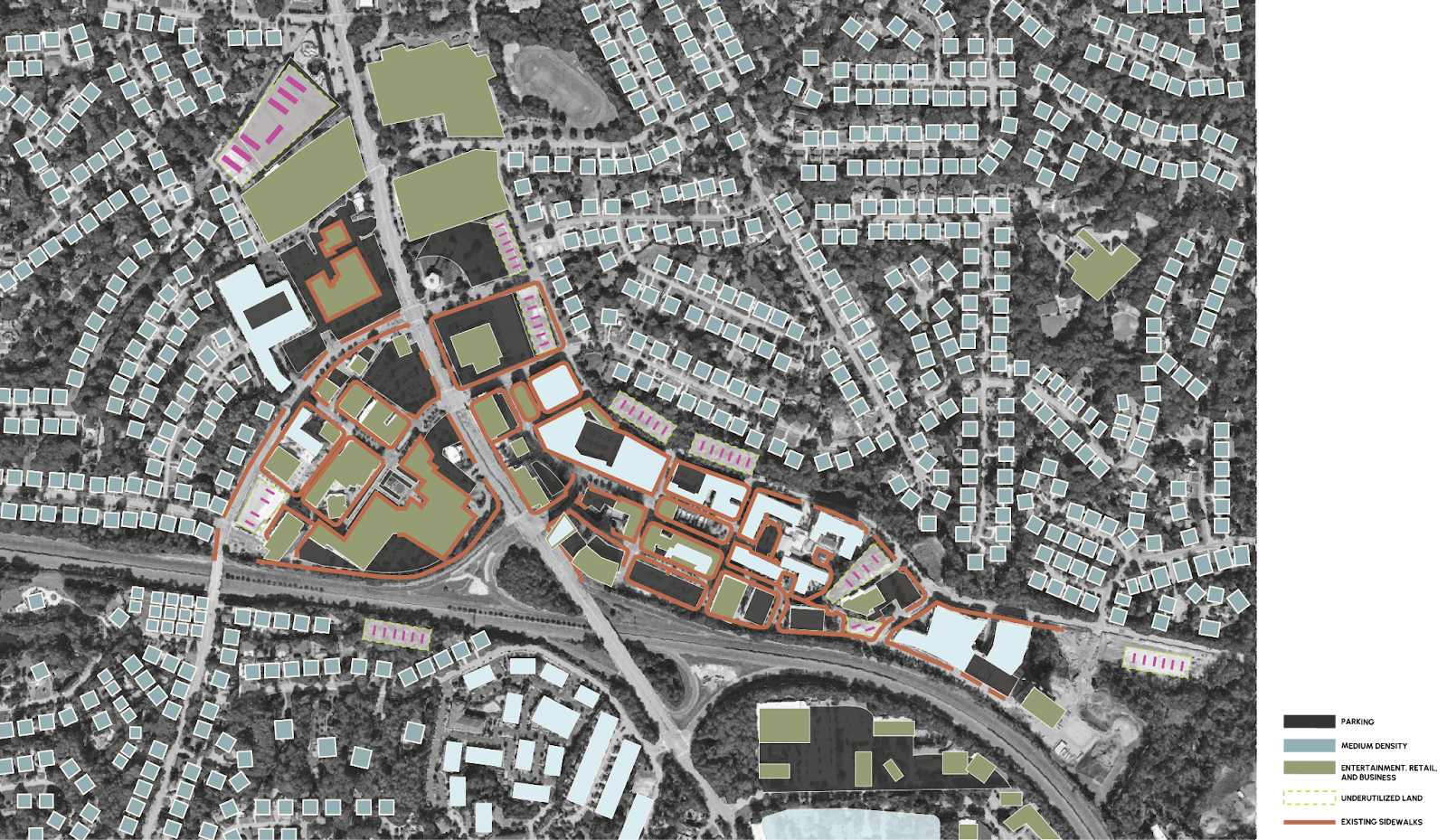 Because residential parking and commercial parking tend to be used at opposite times of day, an opportunity exists for the same parking lot to serve a dual-purpose. The residents of medium-density housing could utilize a portion of these commercial parking spaces during businesses’ closed hours (mainly at night and in the morning). Conversely, customers who drive to businesses during the day would fill these same parking lots when residents need them the least (during work hours). This way, parking lots could transform from some of the most underutilized spaces (sitting empty at night and in the morning) to land that is always being used.