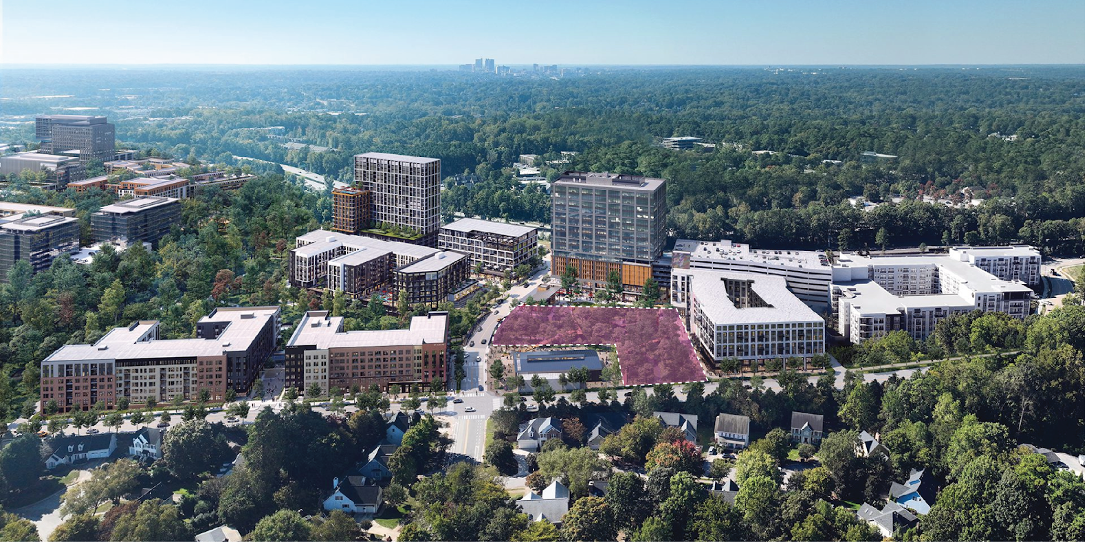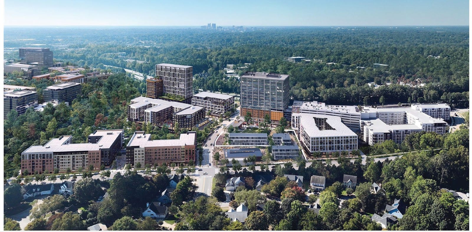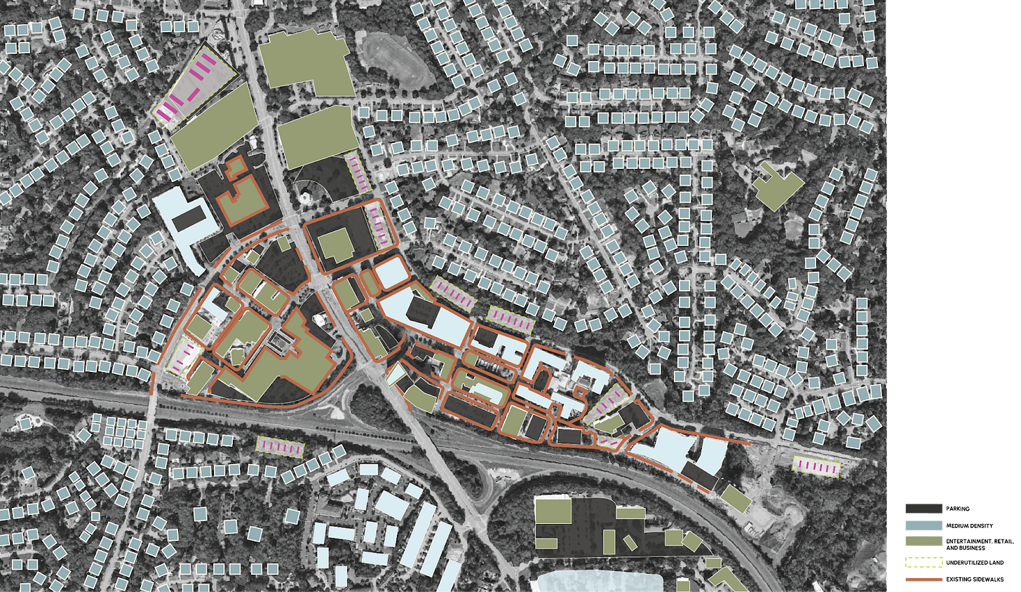 Look at any new mixed-use development in the Triangle and you’ll see the same thing: beautiful storefronts, polished plazas, thoughtfully branded apartment buildings… and a sea of parking separating it all from the neighborhoods next door. Mixed-use districts promise walkability, vibrancy, and density. Single-family neighborhoods promise stability, privacy, and calm. But between them? Four-lane roads, surface parking, retention ponds, and zoning walls. The result is a landscape of fragmented, isolated destinations.