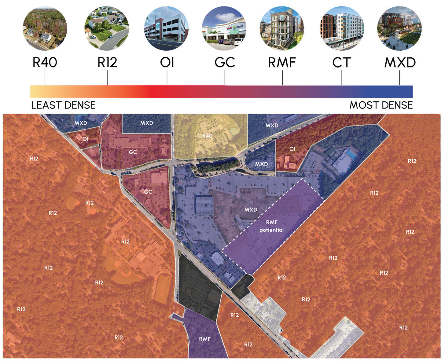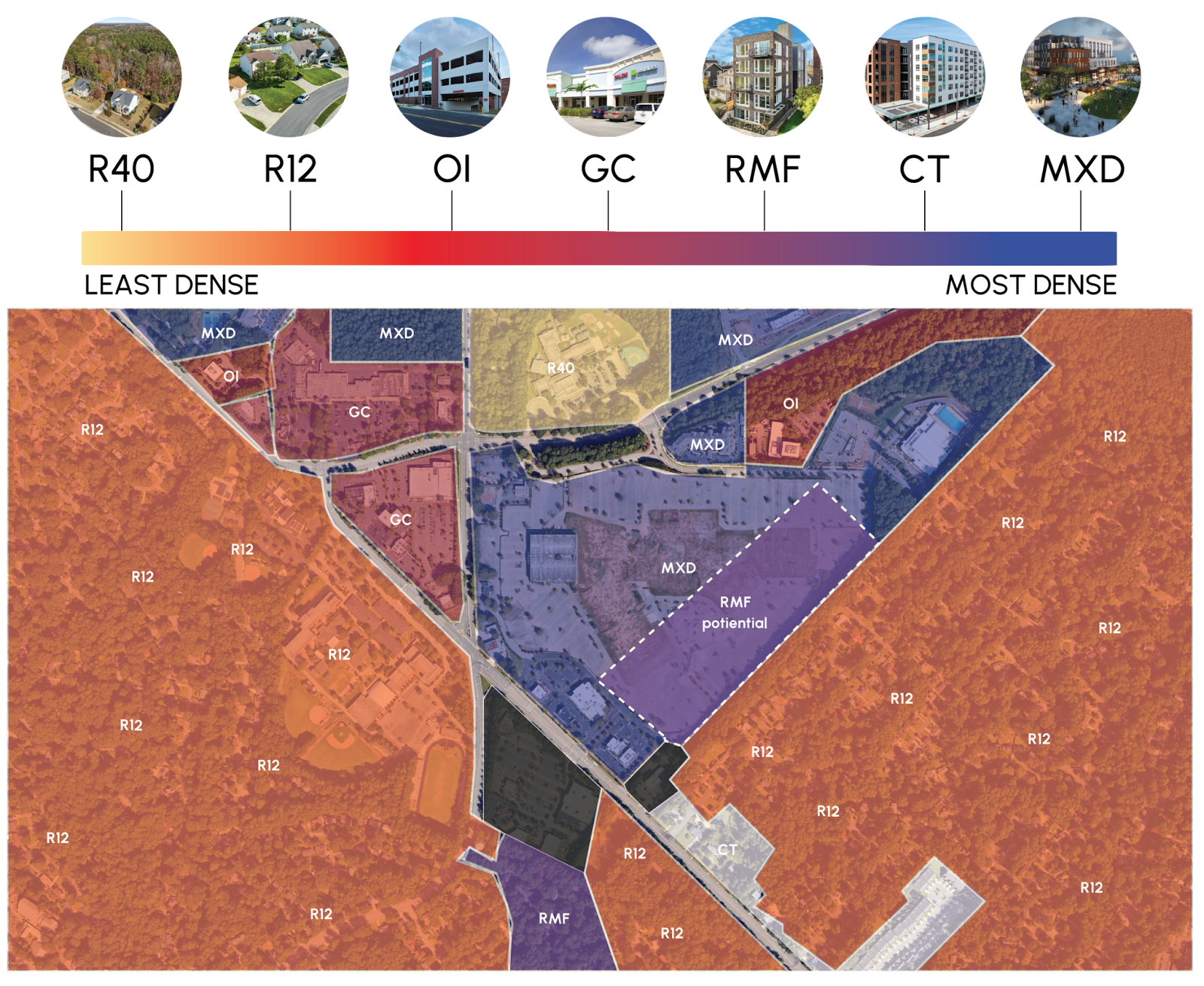 The above diagram illustrates how Cary Towne Center could be reimagined with mixed-use and residential multifamily housing to better integrate with its surroundings. By utilizing the vacant parking spaces, much needed medium-density housing could be created right next to mixed use zoning. If large-scale apartment buildings with first floor commercial developments were to be created in the MXD (Mixed Use District) zone, single-stair buildings in the RMF zone would serve as both a buffer and a connector between commercial establishments and the existing neighborhood.