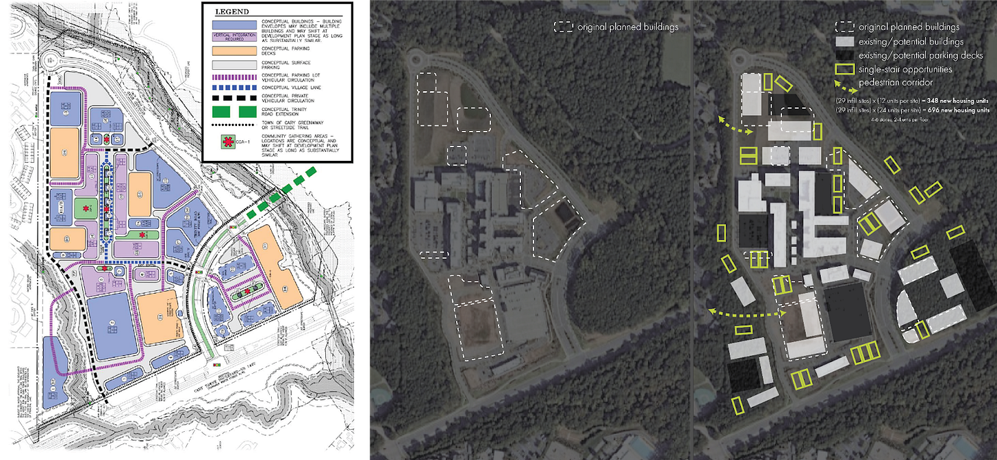 Take the aging strip centers across Wake County. Instead of redeveloping them as one massive mixed-use block, allow incremental infill throughout unused lots and parking lots… one small building at a time.