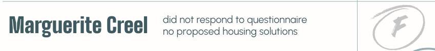 Marguerite Creel earns an F. She did not respond to our questionnaire, and her public materials do not articulate a coherent housing policy for Wake County. In her public responses, questions about sprawl and housing were redirected toward unrelated priorities, and her comments on homelessness focused on relocating individuals rather than addressing housing supply, rental assistance, supportive housing, or the County’s funding role. We did not see engagement with the core systems that shape housing outcomes. Wake County’s housing shortage requires actionable, policy-based leadership, and housing solutions are not reflected in her platform.
