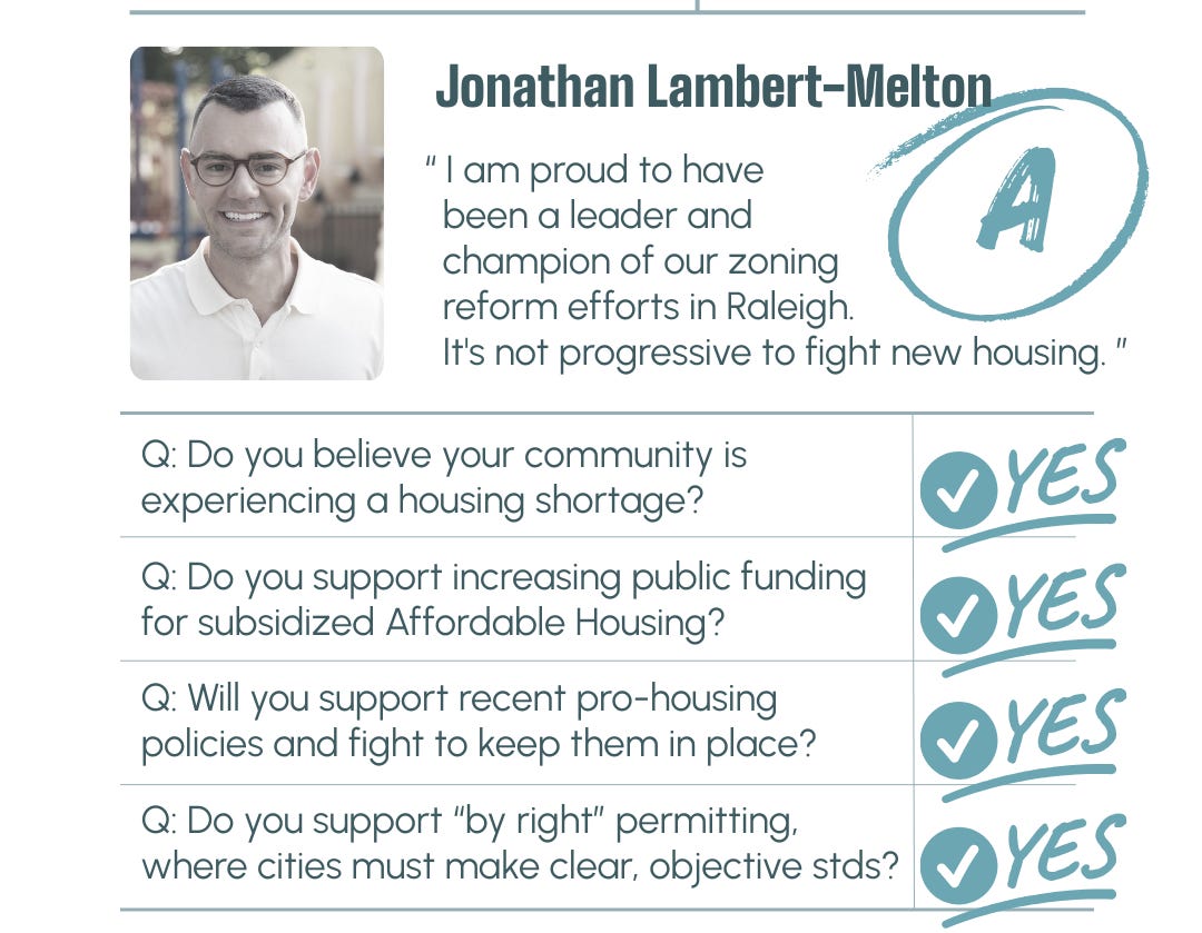 Jonathan Lambert-Melton earns an A for his proven pro housing record and continued leadership. As a Raleigh City Councilor, he has been a champion of zoning reform, ADUs by right, missing middle housing, and ending exclusionary zoning. He consistently supports both housing supply and targeted public investment in affordable housing. Jonathan understands that supply, subsidy, housing stability, and transit all work together, and has backed housing first programs, tenant protections, and transit oriented growth. His commitment to expanding these reforms countywide demonstrates the kind of leadership needed to address Wake County’s housing shortage at scale.