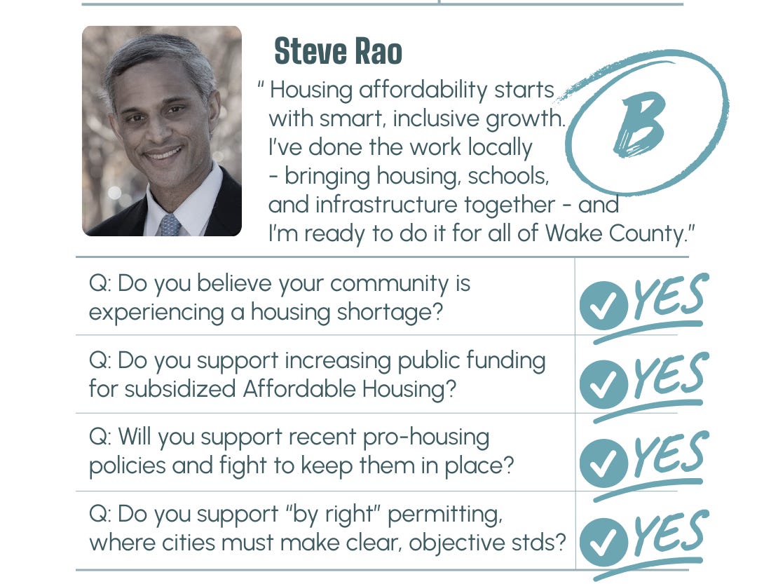 Steve Rao earns a B for his support of missing middle housing, transit oriented development, and predictable permitting reform. He is the only candidate who offered a concrete proposal - to restore the Wake County Housing Fund from $5 million back to $10 million - demonstrating a commitment to affordability. While he emphasizes affordability targets, we would like to see a stronger and more explicit commitment to expanding overall housing production across income levels as the central solution to Wake County’s shortage.